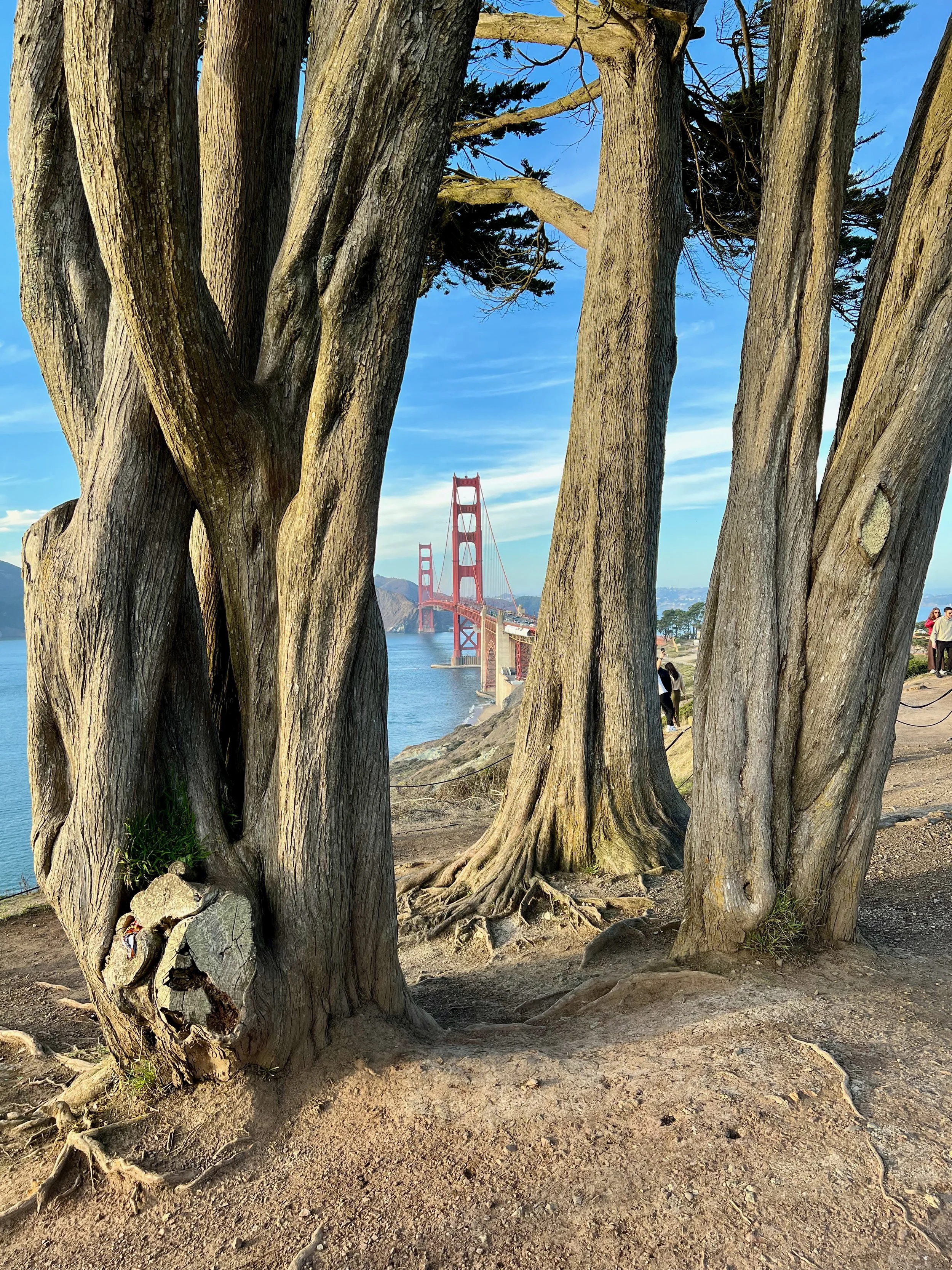 Getting closer to the Golden Gate Bridge: Great views through the Monterey Cypress trees.