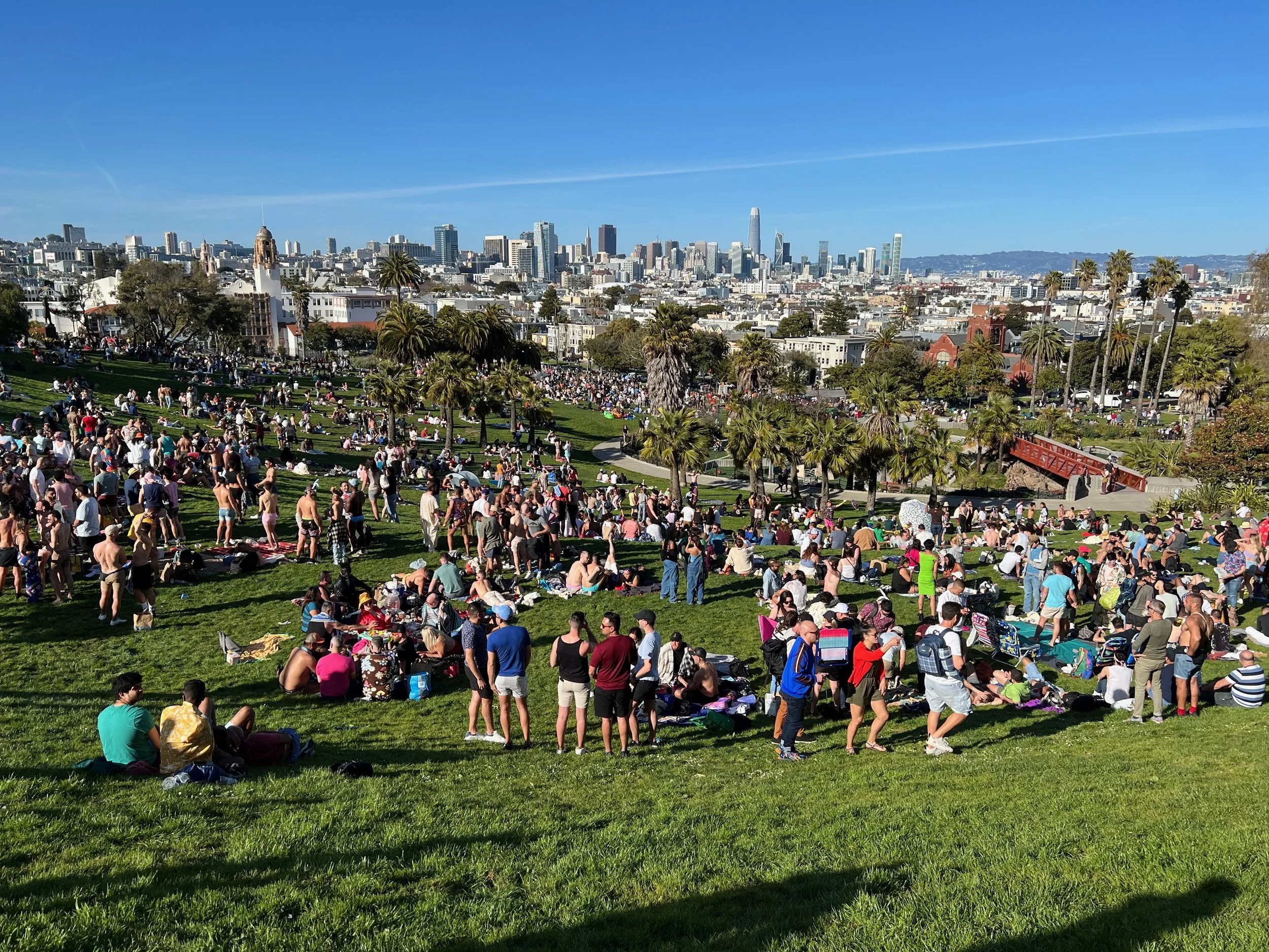 Honestly, I wasn’t sure if I should include the Mission Dolores Park in this viewpoints list because it is SO MUCH more than a viewpoint: You can easily chill the entire day here with friends, have a picknick with your significant other, or just soak in the energetic atmosphere. On the weekend, there is always a lot happening. Down the hill, on the North end of the park, there are a couple of incredible food options, including ice cream and Mexican food. Also in this area, there is a great small supermarket (Bi-Rite), where you can get something to drink as well as prepared food. On the weekend, there are often small, local businesses around that offer products such as sweets or even handmade soap. For kids, there is also a playground embedded in the park.