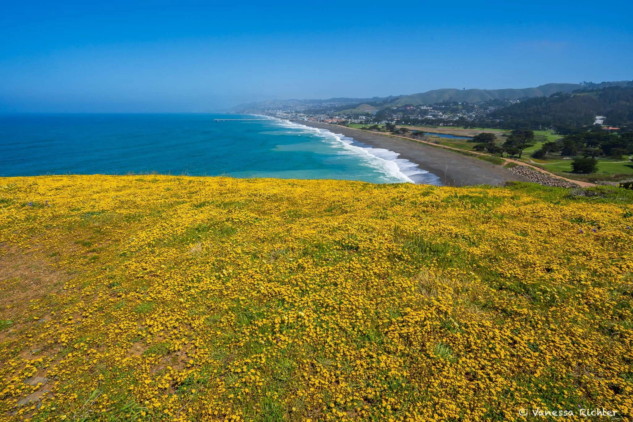 Carpets of goldfields cover the hillsides of the bluff with a view of Sharp Park Beach.
